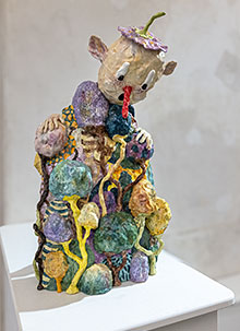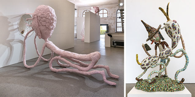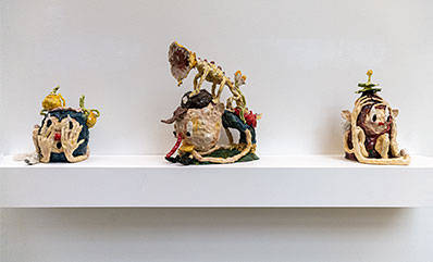 Joakim Ojanen (f. 1985, Västerås) fick efter sin examen från Konstfack (2015) relativt snart en lyckosam internationell lansering. Hans ofta absurt skruvade, men naivistiskt kärleksfulla, keramikskulpturer togs emot väl på den amerikanska konstscenen. Redan 2017 ställde han ut i New York (se länk nedan) och är numera ganska så sällan visad i helfigur i Sverige. Så den omfattande utställningen med elva verk på Hospitalet i Stockholm är ett tacksamt återseende av denna särpräglade konstnär. Få visar en sådan kreativ produktivitet och har ett sådant berättardriv i tredimensionella material som Joakim Ojanen.