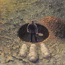 Kroppens stressreaktion lägger sig tillrätta i Rådbergs rosa ljus och vi klättrar med de andra ner i gropen, ner i den trygga och tysta underjorden. I ett kallt rosa sken rör sig en grupp människor, lite förvirrat och obeslutsamt. Mitt ibland raserade huskroppar har de parkerat sin buss och nu samlas de kring en krater i vilken man kan ana en mörk dörröppning ner i marken. Målningen är en av de större i rummet och den ger en tydlig stämning.
