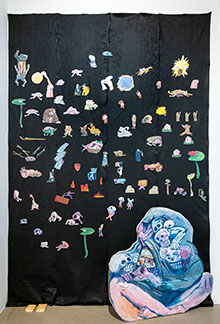 Näckrosbladen flyter som heliumballonger och skapar ett viktlöst tillstånd i det första rummet. Som betraktare och drunknande leds man via dem under tystnad in mot utställningens epicentrum. Därefter skruvas volymen upp ju fler verk man tar del av. Bakom ryggen mot den svarta filten snattrar alla gemensamma birollsinnehavare ut sin absoluta tro på att tillhöra fokus eller alltings mitt. Apan och Geten och han som bär skallen dividerar utan att nå en lösning. Samtidigt är flera självutnämnda antihjältar på flykt undan tigerhjärtan eller räds risken att sväljas hela av en grodkäft. Drömmar, sanningar och vanföreställningar klättrar längs väggen.