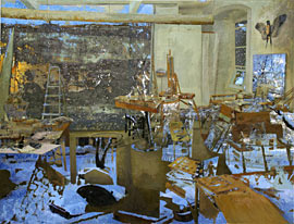 I några målningar på den retrospektiva utställningen i Konstakademins salar ("I ateljén" och "Öppet fönster, ateljén") skiktas inne- och utemiljöerna till ett drömlandskap av ömsom kallt och varmt ljus. Till rekvisitan hör skrivbordslampor, parkbänkar, stafflier, parklyktor och snömålningar som står på golvet i ateljén - lutade mot en pinnstol - strax bredvid en snödriva. Just så fungerar en målning av Bo Larsson som bäst: när målningarnas yta, på Lennart Rodhes vis, har så många in och utgångar att blicken kan smita in och ut labyrintiskt utan att någonsin riskera att komma i mål.