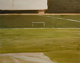 Minne och förlagor knyts samman med andra målares förhöjda vardagar. Simonson blir i ”Vallen #1” en Corot eller Hill för sin tid. I andra målningar drar han sig tillbaka och ger abstraktionen en mer bärande roll; där får ljuset tala. I ”Heden” med den novembergröna fotbollsplanen tar tecknen över, med den vita oslutna rektangeln markerande målet.