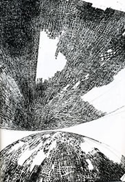 Om teckningen vore kött, skulle Erland Brands tålmodiga rispande tatuera in tillvarons minsta beståndsdelar till en sammansatt helhet. Ibland är arbetet tvärt avbrutet och tecknen spårlöst försvunna i den vita avgrunden. Köttet är inte bara kött utan även dess frånvaro. Ett vitt ark prepareras med tecken från skrivmaskinens spelande spindelarmar.