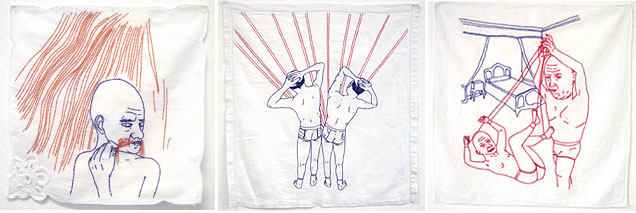 Sedan var det det här med tekniken. Allt i Boinots bilder är broderat. Stygn för stygn har hon trollat fram sina män på små vita spetsnäsdukar, det är bara på håll som allt ser tecknat ut. Broderiet accentuerar ytterligare denna fascinerande upptagenhet, det tidskrävande hantverket skänker bilderna en meditativ aura.