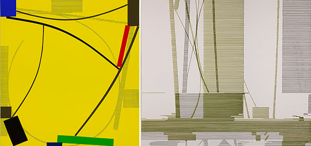 När John Stenborg ställde ut på Konstakademien 2010 gick det mesta i svart, vitt och grått, men här brusar färgerna i klart gult, rött och blått och mildare variationer av grönt, lila och grått. Ibland sätts perceptionen på prov – linjer som inte finns dras ut och obefintliga rörelser startar. Ibland blir målningarna mindre klara, som skuggor ur de slumpgenererade bildernas skiftningar. Det är bilder som spelar med tyngd och lätthet, vila och rörelse. Att se balansen som princip ordnad i vår komplicerade tid skapar en känsla av lättnad.