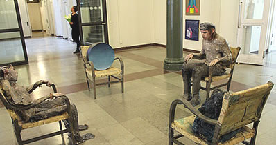 En övergiven trasig husvagn står på innergården, en installation av Martin Fridén. Det är fascinerande med betydelseförskjutningar över tid. På 1950-talet var en husvagn symbolen för den ultimata friheten, att färdas med familjen längs vägarna och kunna stanna var som helst. Idag det rakt motsatta – hemlöshet.