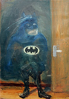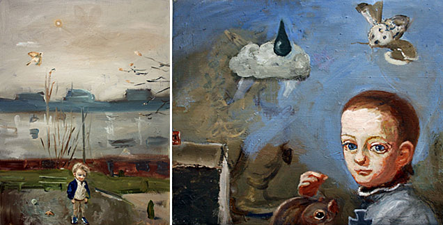 Och när pojken står öga mot öga med en björn under en ensam stjärna utanför höghuset, eller som i målningen På gården vistas ensam ute i kylan, är det med stor sannolikhet barndomens utsatthet han skildrar.
