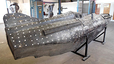 Göran Hägg är den utställande trions enfant terrible. Med en synbarligen ohejdbar och vittförgrenad fantasi producerar han sina stora krigsflygplan, sin märkliga cykel med omkastade delar, sin ubåt, sina poserande figurer med rustningar och sina maskingevär.