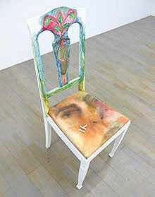 Således är det konstnären själv som svävar i ryggläge (mellan liv och död?). På tygstycket Röda Prince Xtra Långa flankeras hon av två resliga änglar, på stolsryggen till Lily of the valley II figurerar hon i svart sorgehatt.