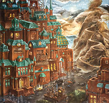 Med denna fråga hängande obesvarad skall det direkt sägas att det var länge sedan man såg Billgren/Kröckert så här visuellt leklysten. Med en ikonografi samplad från dataspel, fantasy, cartoons och österländsk etnokitsch blir resultatet både omtumlande och förföriskt. Målningarna balanserar i en sagovärld på väg att upplösas, med ett frosseri av småfiffiga illustrationslösningar. Detaljnivån är hög, exempelvis är tegelstenar och takpannor på de (ofta) kollapsande husen minutiöst och lite snitsigt frammejslade.