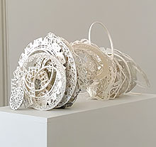 Utställningens titel är Metropolis och de flesta verken har rubricerats därefter. Väggreliefer i laserskuren metall i milda industrifärger spinner vidare på temat kring ett hem. Här förvandlas det till bortrationaliserade och sammanpressade begrepp, för att läggas skikt på skikt över varandra som dekorativa tårtpapperslika rundlar. Men trots min förväntan roterar de inte. Samtidigt ser jag redan ett av utkasten i min föreställning som förverkligad, en mäktig flerfärgad metallkonstruktion som skulle rulla fram i det offentliga rummet, på ett torg eller framför en imposant entré. Det får vänta på rätt beställare.