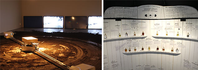 Lisa Jeannin och Rolf Schuurmans visar arbeten som kallas spagyriska. Det handlar enligt teorin om att abstrahera vissa växter till högre kraft och potens. Deras utställningsdel är ett svart tält och inuti finns hyllor mot vitmålad brädvägg. Där står burkar med olika växtextrakt med en kort beskrivning av deras egenskaper som läkande krafter ”i samklang med naturens kretslopp och himlakropparnas rörelser”. Det ser mest ut som en välstajlad hälsokostbutik. Och någon magi kan jag inte erfara trots flera besök.