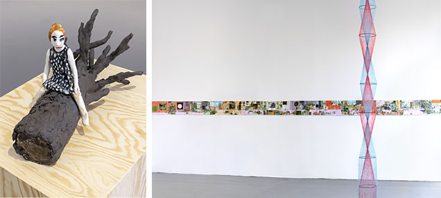 Klara Kristalova är representerad med En annan hästflicka, som funnit sin drömspringare i rotvältan. Hennes utropstecken till blick förmedlar verkligen utropet inför intermezzot och uttrycker vad säkert alla känner inför detta extrema avbrott i tillvaron som genomlids i olika tonarter denna vackra men dystra vår. I nästa rum visar Idun Baltzersens flätade flickfrisyrer oss nacken och bildar sitt eget mönster mot en nästan figurativ upplösning. Mamma Anderssons halvt frånvända profil bygger också på det taktila linjespel som hårlockarna inbjuder till, ställt mot en lätt belyst kind. Frånvaron är monumental och bildar ett formens tecken som korresponderar med Sara Vide Ericsons vita urna ställd rätt ut i landskapet.