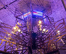 Rummet fylls delvis av ett förföriskt lila sken, strömmande från ett torn av gjutjärn. Som en otillgänglig vaktpost spejar det ut över de närliggande verken. Organisk som ett spindelnät i sina former och med tecken på förfall är det som om tornet står där i trots mot tidens gång och vill med sina lampor ge sken av modernitet. En mäktig konstruktion som närmast liknar en kristallkrona hänger intill och glittrar i ljuset. Går man nära upptäcker man inte bara kristaller utan också en konstruktion av metallnät, kedjor och sladdar. En sirlig attrapp.