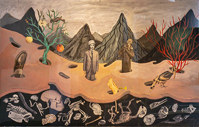 I det intilliggande rummet visas ännu ett samarbete, i detta fall tillsammans med dramatikern Malin Axelsson och boken Mitt liv som detektiv. Här har bilderna en annan karaktär. Måleriet är mindre återhållsamt och rör sig lekfullt över pannåerna, otyglat och flippat. Kolet har fått blanda sig med färgen och sätter fart i något livligt och dunkelt. Här och var lägger sig ett kollage på ytan och olika lager av verklighet skapas. Berättelsen är den om en originell barnvakt, varglik och rätt så obehaglig, men inte utan värme och humor. Själva berättelsen finns närvarande men är inte bärande för dessa målningar.