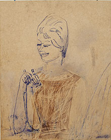 En kvinna blundar och ler brett samtidigt som hon genom ett slags dubbelexponering för sin cigarettkrönta hand fram och tillbaka. Röken har lagt sig mjuk och smidig över hennes hals och smyger vidare i sidled. Klänningens bruna tyg får sin glans genom bortskrapningarnas negativa streck och endast ansiktet och handen framträder med tydliga konturer. Det finns en anspråkslöshet i Billgrens val av material som istället för att förringa bildens innehåll snarare förstärker och fördjupar den. Tunt vitt papper och pannå möter kol, krita och akryl. Ibland klättrar papper över varandra, letar sig runt föremål och lägger sig och vilar på oväntade platser. Kroppar bygger ihop sig för att sedan bryta upp och skaka av sig det tvinnade.