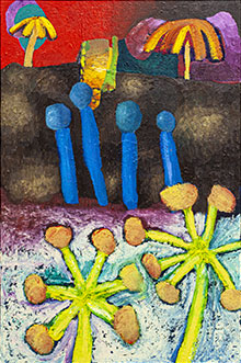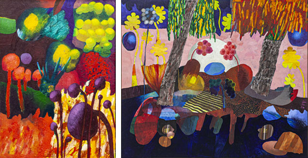 Det bubblar och knäpper av organiskt liv. Allting växer och knakar, skjuter skott och trycker sig sakta uppåt. De intensiva målningarna är en urladdning, likt en tryckande energi som samlat sig i marken och nu äntligen spräcker sig fram genom jordytan. Färgerna är mustiga och djupa, som sammet ligger de över dukarna och blicken tillåts sjunka djupt. Här och var ligger färgen tjock och krämig, ditlagd, bortskrapad, bearbetad. Skarpa övergångar möter det mjuka och måleriskt fluffiga i detta taktila måleri. Ytorna kommunicerar, knopparna spänner och trycker, sporerna dallrar och gungar.