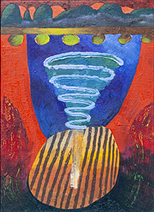 Intill målningarna står träskulpturer där de levande formerna får en annan fysisk närvaro. Träet är hugget, skuret och raspat. De grova och talande dragen blir som en direkt överföring från måleriets kraftfulla men ändå inkännande rörelse. Olika material men samma uttryck, samma röst som talar. Det levande träet har avklätts och formats till uppförstoringar av annat levande och spirande. Dess åldersringar ligger synliga och påminner oss om cyklisk tid.