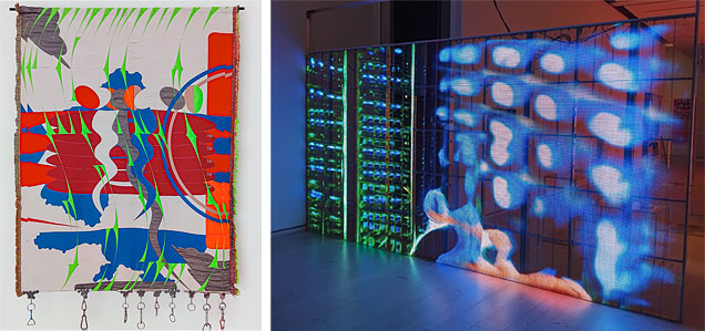 Konstnärsduon Metahaven (Vinca Kruk och Daniel van der Velden) visar vävda textilier med abstrakta mönster sida vid sida med dataprojektioner med ett likartat estetiskt uttryck.