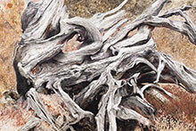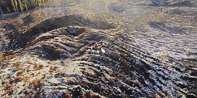Vare sig det handlar om inre eller yttre landskap – Ericson sparar inte på krutet. Det kraftfulla måleriet sträcker sig långt ut i rummet som i Subterranean Conscious, en gigantisk målning sammanfogad av tre delar. På ett kalhygge vandrar två pyttesmå figurer i vårvinterlandskapet, den ena släpandes på en släde. Den sublima känslan blandas med frenesin i Sara-Vide Ericsons teknik; de tjockt utspritsade stråken av markytans nyanser framhäver inte bara själva materialiteten utan också det underliggande och genomsyrande engagemanget.