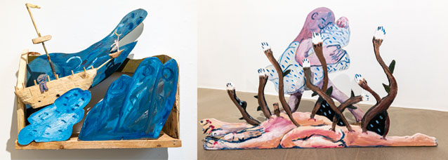 Människosöner bugar, bockar och böjer sig och tyngs. De lösgörs under sina predikament. Våren växer och knoppar brister som aliens direkt ur hudens tunna barriär (minns filmen). Andra flyr med fjäderdräkt och låter Emily Dickinsons strof ”Hope is a thing with feathers” få en rent sinister innebörd. Jesper Thours verktygslåda har utvecklats till tablåer i tre dimensioner, snidade figurer, måleri och objekt som flödar in i och genom varandra. Självklart är skogen rätt plats att stöpa om till en stenkaka, eller åtminstone en akustisk dröm och hemsnickrad skivspelare.