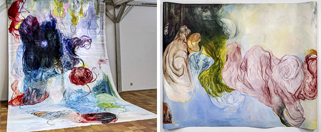 Denna levda kropp utvidgas genom måleriet och tar plats i rummet med en eteriskt skimrande lätthet. Med inrullade sidor smälter målningarna in i väggen. Här finns inget skrämmande och kusligt, snarare något sublimt, trevande och utforskande, en nyfikenhet utan rädsla. Jag påminns om de fladdrande tygsjoken i germanskt renässansmåleri, hos en Matthias Grünewald exempelvis, aktualiserat av den nyss timade påskhelgen.