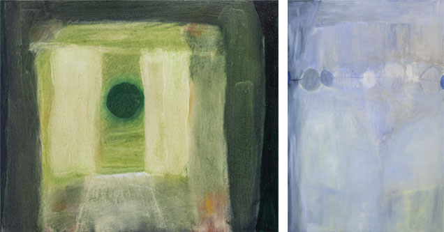 Ett tunt, ljust lager sveper över en av målningarna, fäster sig på formerna som en slöja. Nere i ena hörnet har det lämnat bakgrunden blottad och en djupt blå färg suger åt sig blicken. Vi anar något där bakom som ligger dolt för oss och det abstrakta agerar språngbräda in i betraktarens inre bildskapande. Bakom slöjan skimrar det sedan grönt och ljuder lågfrekvent som ett litet spinnande djur. Kanske är inte bakgrunden dold för oss utan skyddad från oss.