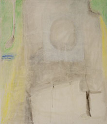 Stillsamt svävar färgen över de stora dukarna, som ett lågt dis över en redan vag minnesbild. De mjuka färgerna upplevs subtila först, nästan utsuddade, men låter man dem verka en stund ser man hur de ligger där på ytan och vibrerar. Motiven är abstrakta och återhållsamma. En samling rundade former sitter uppradade som pärlor på en tråd. Den kröker sig lite uppåt som att den spänns, kanske trycks över någons hud. Bildens gråblå toner transcenderar genom en isblå färg som frostigt kryper fram över ytan.