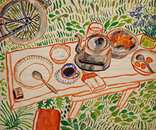Utställningens tidigaste verk, Frukost i det gröna med Maos lilla röda från 1969 har överraskande mycket gemensamt med hennes fortsatta teknik att gestalta ett lågmält, alldagligt, engagemang – men kännetecknas också av, något jag inte tänkt på tidigare, en starkt konsthistorisk medvetenhet. Det senare förklarar också hennes, likaledes överraskande, stilistiska sökande under samma period. Under de tidiga åren växlar hon så obekymrat mellan surrealism, kubism och socialrealism att jag svårligen hade kunnat allokera de här bilderna till Gittan Jönsson.