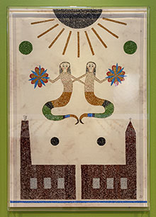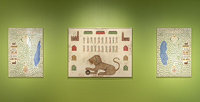 Vi kliver in i en odefinierbar tid. De vita dukarna har fläckar efter händer, som att de hanterats av många generationers fingrar. Det måste ha varit arbetande händer, där jorden och smutsen legat oåtkomlig långt in under naglarna. Bilderna liknar äldre väggbonader både med sin symbolik och symmetri samt i Svenssons sätt att måla, hans naivistiska “broderimåleri”, där akrylfärgen sprutats ut i små tunna streck som sedan torkat tredimensionellt på ytan. Materialet bedrar oss, blir ambivalent på ett sätt som väcker misstänksamheten och skärper sinnet. Samtidigt vaggas vi in i ett behagligt lugn av väggarnas varmt gröna färg.