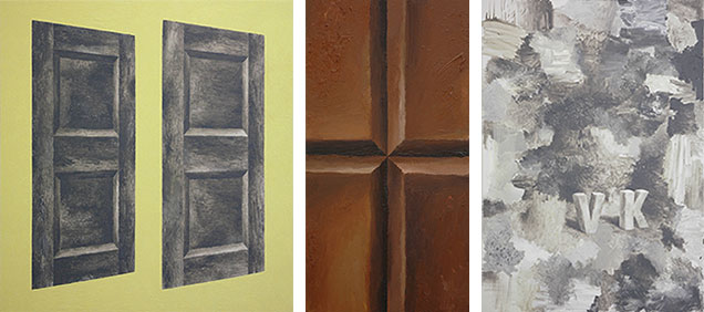 Men utställningen på Galleri Magnus Åklundh utgörs mestadels av målningar av gråa spegeldörrar mot en blekt monokrom bakgrund. Även om det kanske inte, rent tekniskt, är så stor skillnad mellan att måla en chokladkaka eller en spegeldörr (en stor fyrkant indelad i mindre rutor är det likafullt) så har naturligtvis läckerhetens lockelserop klingat av när motivet blivit så mycket mer robust. Istället för att vattnas i munnen signalerar spegeldörrens, mycket mer allvarstyngda rutmönster oro, förväntan, försiktighet, nyfikenhet…