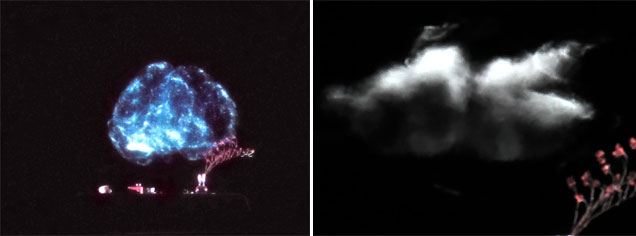 Hur det tekniska i övrigt fungerar hör kanske inte hit – förutom att reda ut publikkontakten. Genom sensorer som besökarna håller i handen och som är kopplade till molnet via datorerna tolkas människornas värme, andedräkt och kropparnas elektriska strömmar. På så sätt blir molnet ett objekt som formas av publikens samlade subjekt. Naturligtvis påverkas publiken av molnets rörelser och interaktion uppstår. Molnet rör sig, ändrar form och färg. Det är visuellt slagkraftigt.