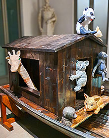 En panda, två koalor, en orangutang, en giraff, en elefant och ett antal fler av världens utrotningshotade djur har fått plats på Hannas ark. De är kärleksfullt naivistiska men aldrig barnsliga. Visst återkopplar Hanna Beling till en hel tradition av mjukis- och gosedjur som vi förmodligen alla haft en starkt personlig koppling till sedan barndomen. Men här tillkommer en djupare konstnärlig beskrivning av fysionomier, gester och poser. Det gör att man som betraktare kastas mellan barnets identifierande reminicenser till den vuxnes fascination över uttrycken och hantverket.
