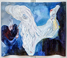 Denna levda kropp utvidgas genom måleriet och tar plats i rummet med en eteriskt skimrande lätthet. Med inrullade sidor smälter målningarna in i väggen. Här finns inget skrämmande och kusligt, snarare något sublimt, trevande och utforskande, en nyfikenhet utan rädsla. Jag påminns om de fladdrande tygsjoken i germanskt renässansmåleri, hos en Matthias Grünewald exempelvis, aktualiserat av den nyss timade påskhelgen.