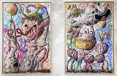 I de två kol- och pastellmålningarna återkopplar Joakim Ojanen i ännu högre grad till en subkulturell serietidningsestetik. De virvlande kritstrecken och den högt drivna koloriten anknyter till naivistiskt "klotter" i den högre skolan – ett tillvägagångssätt som kan sägas vara ett signum för Ojanens skiss- och linjeföringsteknik.