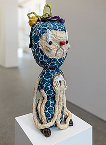 Joakim Ojanen (f. 1985, Västerås) fick efter sin examen från Konstfack (2015) relativt snart en lyckosam internationell lansering. Hans ofta absurt skruvade, men naivistiskt kärleksfulla, keramikskulpturer togs emot väl på den amerikanska konstscenen. Redan 2017 ställde han ut i New York (se länk nedan) och är numera ganska så sällan visad i helfigur i Sverige. Så den omfattande utställningen med elva verk på Hospitalet i Stockholm är ett tacksamt återseende av denna särpräglade konstnär. Få visar en sådan kreativ produktivitet och har ett sådant berättardriv i tredimensionella material som Joakim Ojanen.