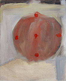 En rundad röd form vilar, inbäddad i trygga grå penseldrag. Det grå flyter in i det röda och dämpar det, sänker färgens puls. Fem klarröda punkter får istället sticka på målningens yta, som en påminnelse om det som ligger latent.