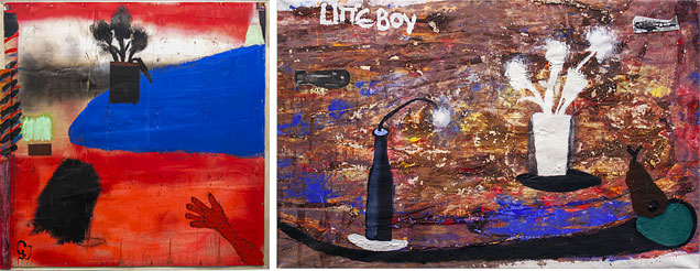 Här finns en tilltro till det intuitiva görandet, till impulsens ärlighet. Färgen förvandlas till blod, vin och näringslösning i en tillåtande och lagom skev process.
