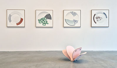 Men något har hänt med tallrikarna mellan kraschen och den varsamma restaurationen. Istället för att skärvorna funnit sina likar har de hoppat runt i något slag av kalejdoskopiskt busstreck där inget mer än den ursprungliga tallriksformen är i behåll i slutresultatet. Till detta kommer själva mödosamheten i tillblivelsen. Istället för att hänga upp hoplimmade skärvor av en gång verkligt närvarande porslinstallrikar är allt målat i olja på duk – fast realistiskt så det förslår.