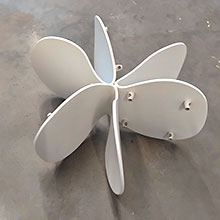 Planheten (som hos en tallrik) är också starkt närvarande i konstnärens eleganta, monokromt målade, små skulpturer i plywood på golvet. Likt gamla tiders origami, skjuter de små skulpturerna ut sina plana ytor kors och tvärs, upp och ner – resultatet är alster som i upprätt form kan stå på egna ben, lika självklart som ett möblemang i en lägenhet.