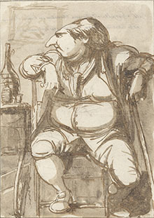 Sergel i Rom sittande vid ett bord med en flaska vin. Blyerts, penna och brunt bläck, lavering i brunt och grått på papper © Johan Tobias Sergel