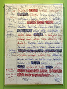 Maktlösheten förstärks genom de oläsliga texter som förstorats upp likt stora handskrivna pappersark. I några av dessa känns texten som en oåtkomlig trollformel, en gammal kunskap som vi inte längre har tillgång till. Många ord är överstrukna, kanske censurerade eller ångrade. Det finns något farligt mellan raderna, mellan det skenbart enkla i detta märkvärdiga arkiv.